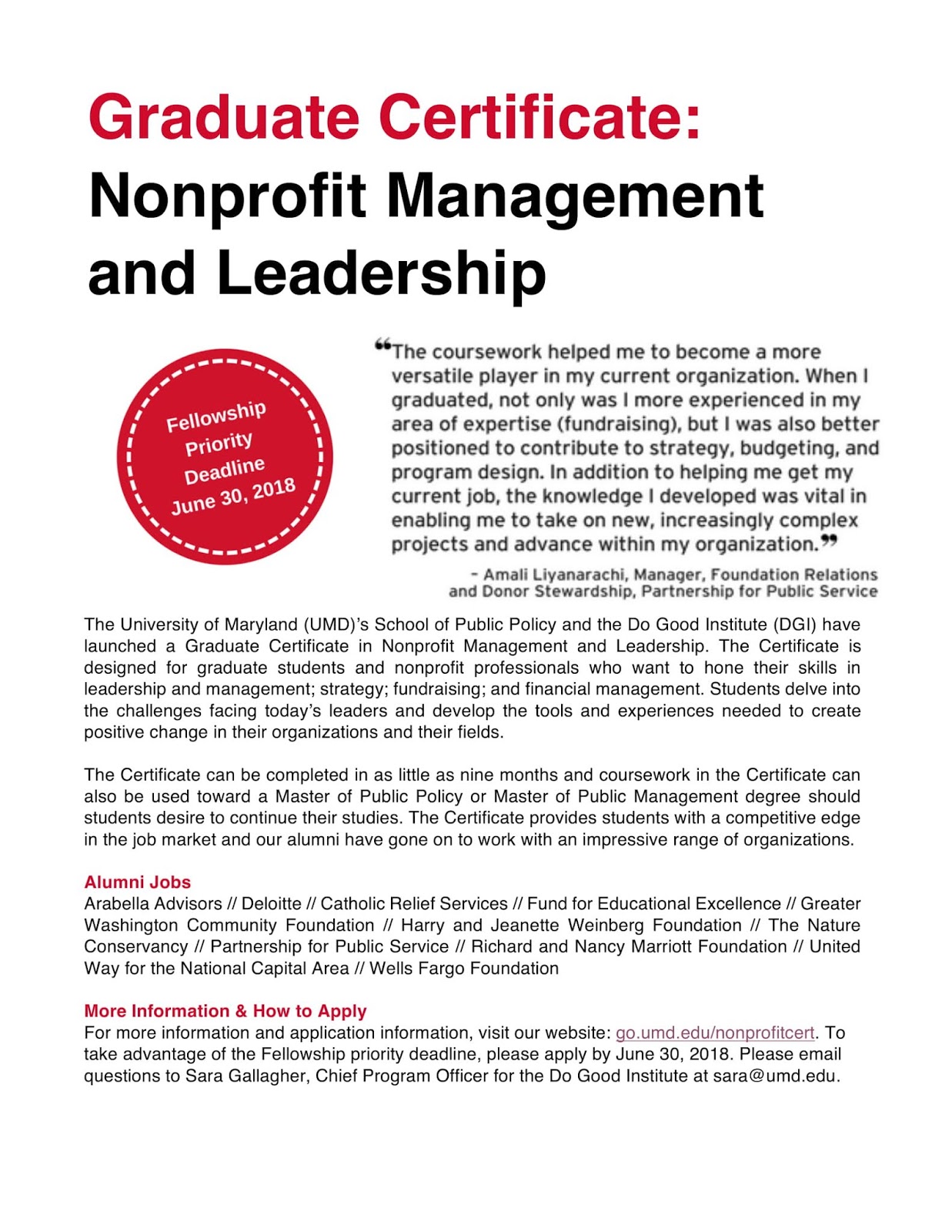 Nonprofit graduate certificate. An online graduate certificate in nonprofit management from mu will help you more effectively manage your resources analyze community needs and prioritize and deliver appropriate services within budget. The professional graduate certificate in nonprofit management requires four courses. The graduate certificate in nonprofit management consists of five required classes. The graduate certificate in nonprofit leadership and management online provides students with an understanding of the nonprofit sectors role in society and knowledge applicable to those who wish to lead and manage nonprofit organizations.