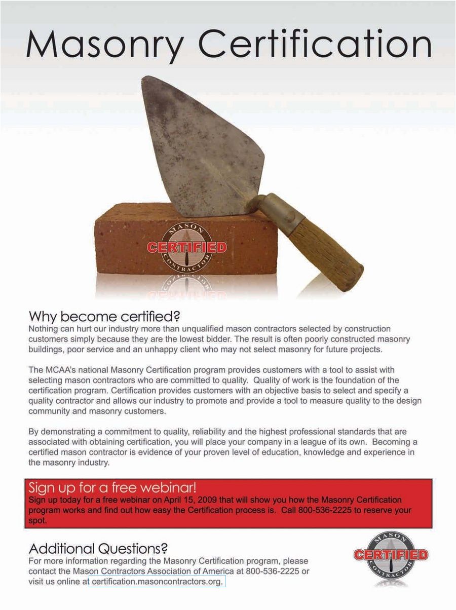 Online masonry certification. Masonry skills courses masonry is an ancient discipline that combines the skills of construction with the detailoriented knowhow of skilled trade. Choose our company brick certification for superior resultswe are the authority in masonry training. The mason contractors association of america mcaa is committed to preserving and promoting the masonry industry by providing continuing education advocating fair codes and standards fostering a safe work environment recruiting future manpower and marketing the benefits of masonry materials. Only brick certification offers a unique combination of convenient extensive online and classroom certifications in a trade that is one of the fastest projected growing careers through 2020.