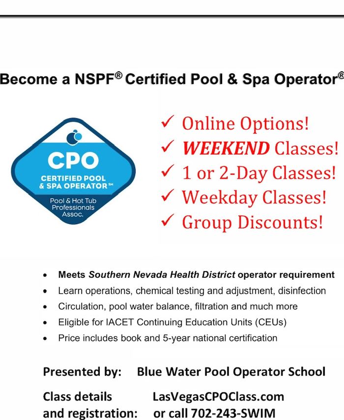 An open book written examination is required. Get certified to be a nspf certified pool operator cpo from the pool training academy nspfs most awarded instructors. The certified pool spa operator cpo certification provides the knowledge techniques and skills for pool and spa operations. This program covers state regulations swimming pool calculations filter types and filter selection circulation systems and pumps water chemistry and balancing water testing spas and warm water pools and aquatic facility management and safety.